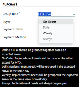 Odoo 19 introduces the ability to group RFQ's based on when goods are expected to arrive, or always: