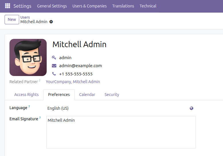 Location: Settings → Users & Companies → Users → [Select User] → Preferences Tab → Email Signature
