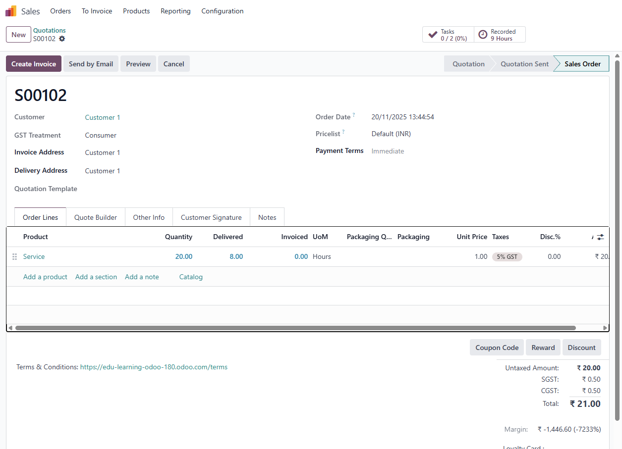 • Navigate: Smart button on SO "Recorded" or by Timesheets APP → Timesheets/All Timesheets menu