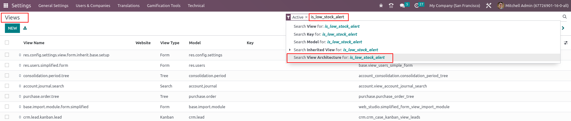 Go to Settings->User Interface->VIews and search the field "is_low_stock_alert" as shown in the screenshot.