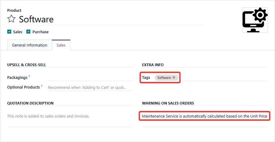 We are tagging the Service, defining a Sales Price (the percentage), defining that we want a Task created in the Maintenance Project to keep track of requests and time spent, and adding Internal Notes to explain the purpose of this Product.