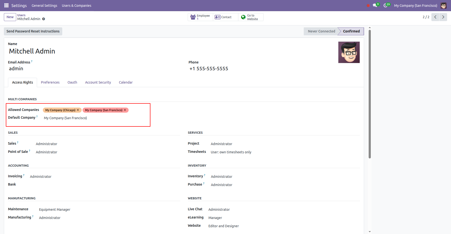 In the access rights section, these users don't have multi-companies enabled, and have access only to their own company.