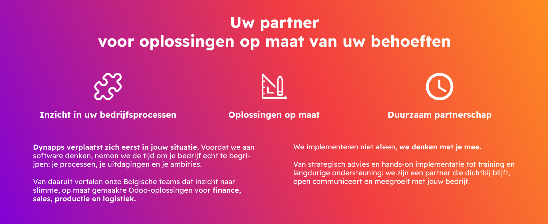 Of u nu Odoo snel wilt implementeren of specifieke processen wilt optimaliseren, Dynapps is uw betrouwbare partner.